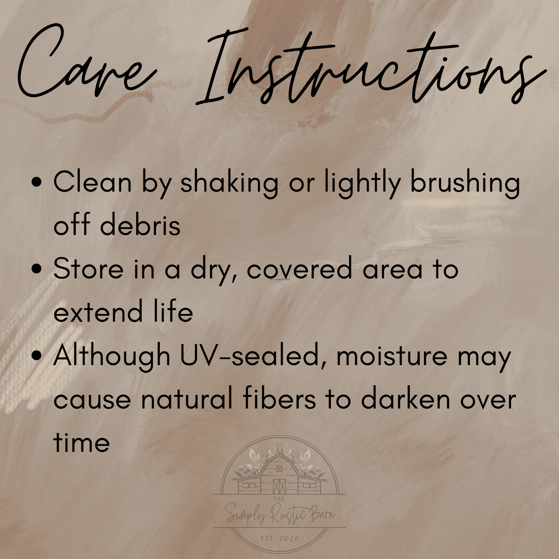 - Though our doormats are UV Printed, We suggest that you keep your mat as dry as possible to avoid darkening of the fibers.